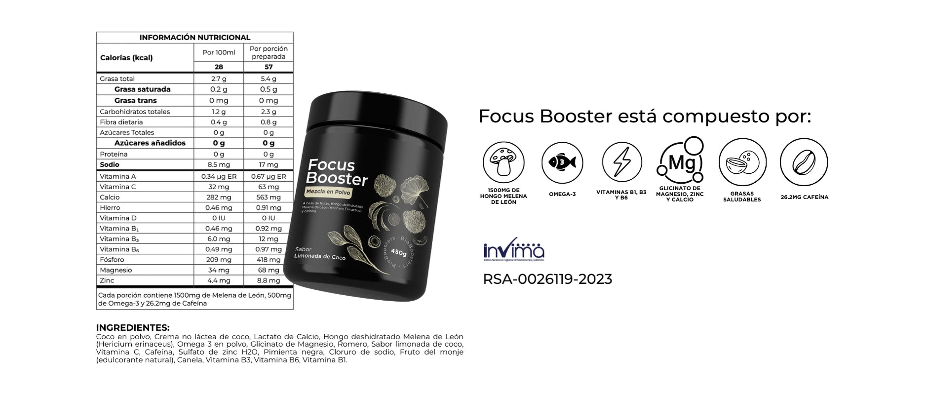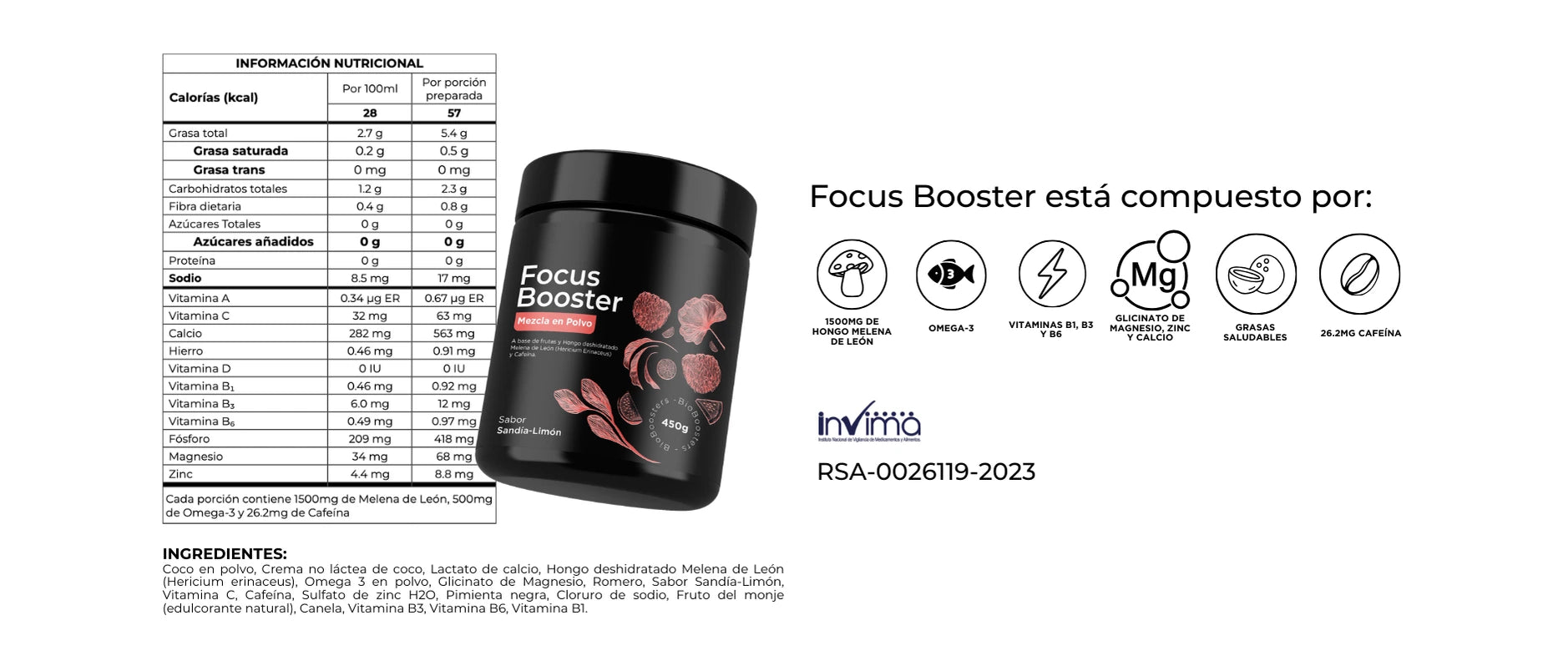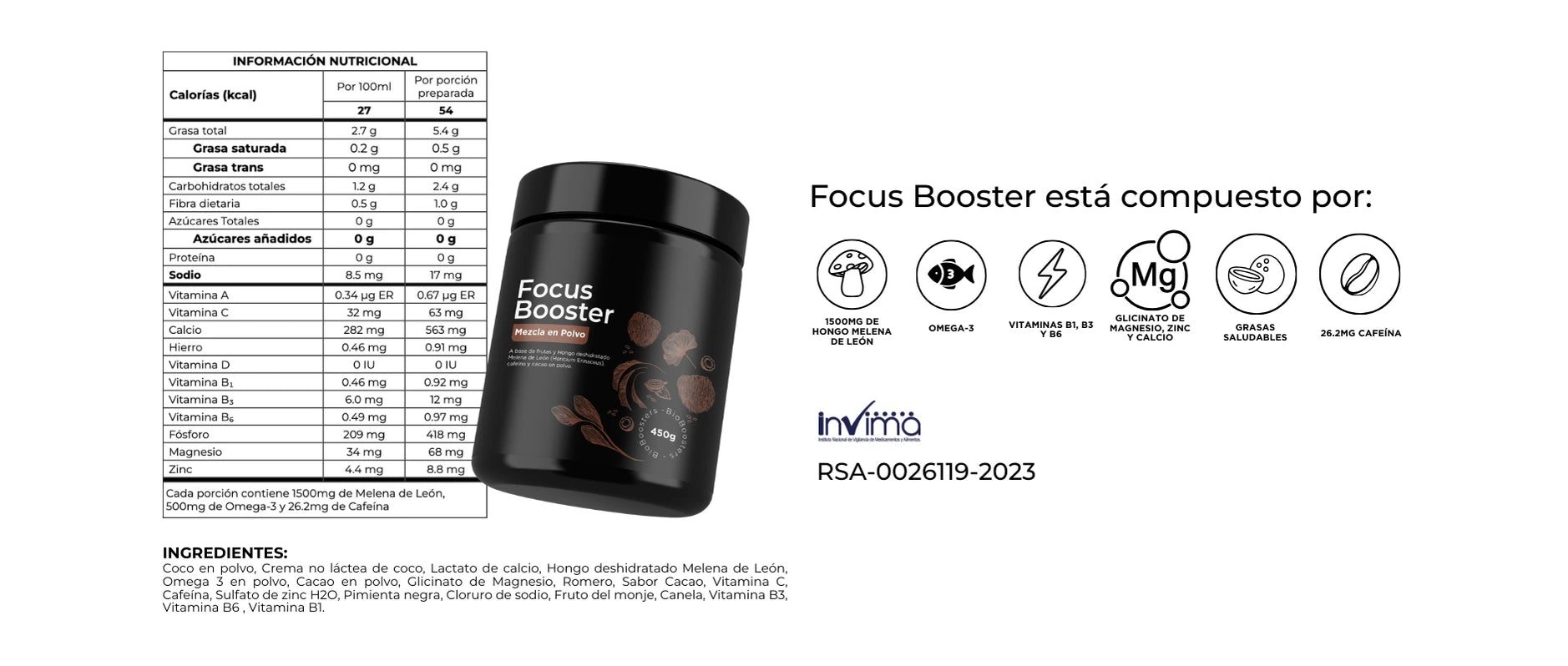 Focus Booster está destinado a adultos y no se recomienda para niños menores a 12 años ya que contiene cafeína (26.2mg).