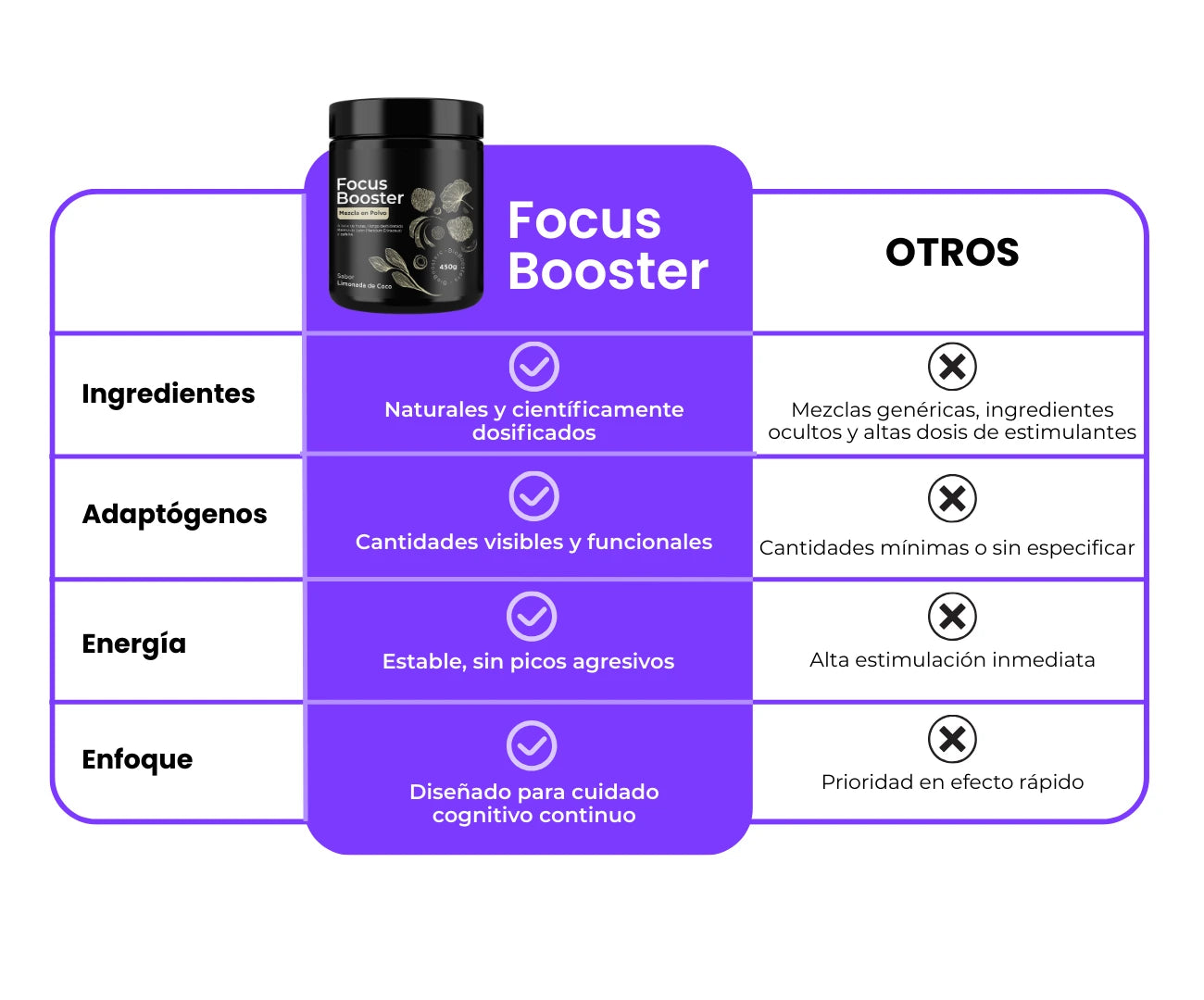 Focus Booster no contiene azúcares ni estimulantes sintéticos. Su enfoque es nutrir el cerebro, no solo activarlo temporalmente.